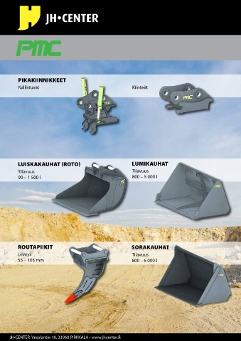 PIKAKIINNIKKEET Kallistuvat Kiinteät LUISKAKAUHAT (ROTO) LUMIKAUHAT Tilavuus Tilavuus 90 – 1 500 l 800 – 5 000 l ROUTAPIIKIT SORAKAUHAT Leveys Tilavuus 55 – 105 mm 800 – 6 000 l JH•CENTER Vesalantie 18, 33960 PIRKKALA • www.jhcenter.fi